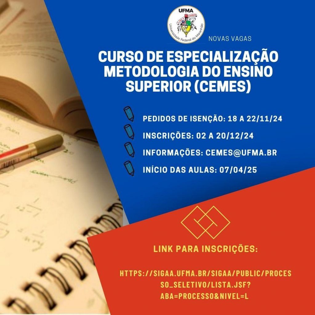 Estamos empolgados em anunciar que as inscrições para o Curso de Especialização em Metodologia do Ensino Superior, conforme o Edital AGEUFMA nº 64/2024, em breve estarão abertas!