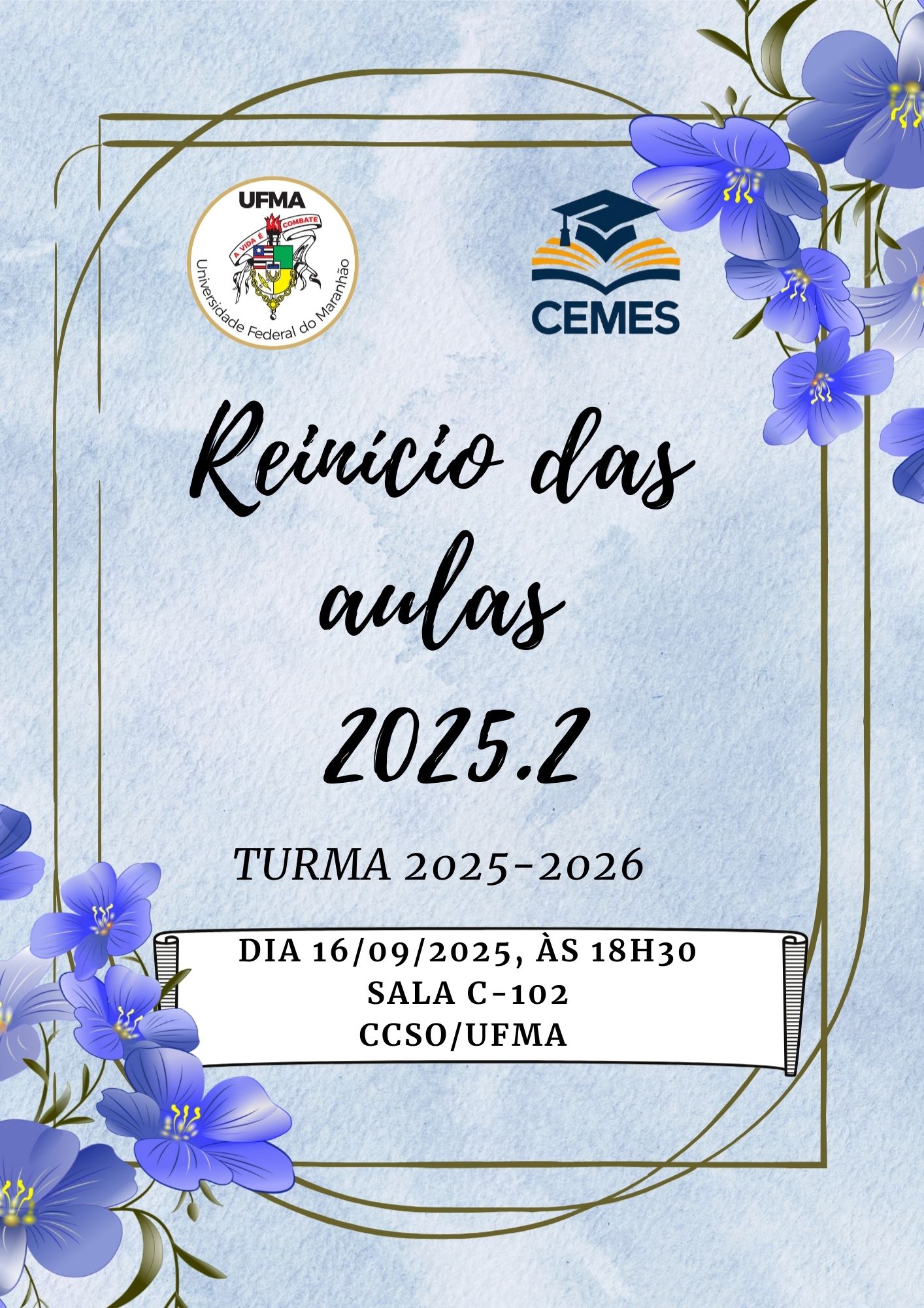 A Coordenação do Curso de Especialização em Metodologia do Ensino Superior (CEMES) informa aos alunos da Turma 2025-2026 que as atividades letivas serão retomadas no dia 16 de setembro de 2025 (terça-feira), às 18h30, na Sala C-102, localizada no prédio do Centro de Ciências Sociais (CCSO) da Universidade Federal do Maranhão (UFMA).